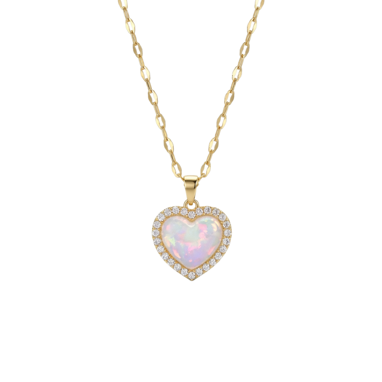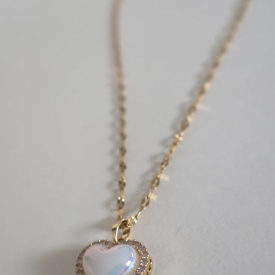 This elegant gold-tone heart pendant features an iridescent center stone surrounded by a sparkling crystal halo, offering a soft, radiant shine for any occasion.